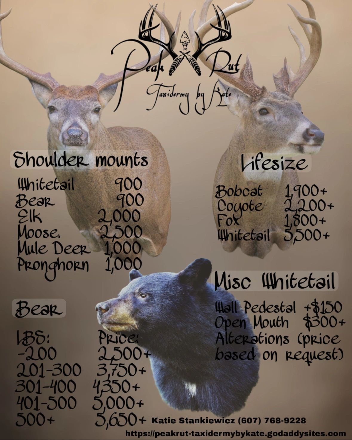Kate has been an Outdoors enthusiast for over 20 years. Hunting, fishing and competition taxidermy are her biggest hobbies. Kate has been doing taxidermy for 5 years now and has won numerous award with her mounts. Recently winning multiple awards in 2025 with her personal buck. Then in 2023 Two second places in New England and two Thirds and a second at the Worlds Taxidermy Championships. She won best of show whitetail, judges choice whitetail and first place with a personal deer.